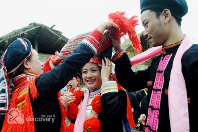 In ancient times, the Dao mastered cotton cultivation, weaving and dyeing. Young girls are still taught weaving and embroidery by their mothers at a tender age and practice their skills well into adolescence. Leisure time for many girls in Dao villages revolves around chatting while practicing their weaving and embroidery skills. When they are ready to marry, young Dao women traditionally make their own wedding dress. This outfit not only helps make the bride beautiful and glamorous on her special day, but also serves as source of pride for herself and her family. |