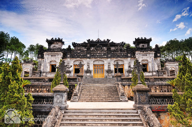 Thuy Bang, Huong Thuy, Thua Thien HueBuilt on the natural slope of Chau Chau Mountain, about 10 km south of Hue city, Khai Dinh Tomb???s is one of the Hue???s wonders. Not only noted for its spectacular scenery and breathtaking combination, the tomb is also noted for the use of ???modern??? materials which were rarely used in the 1930s.